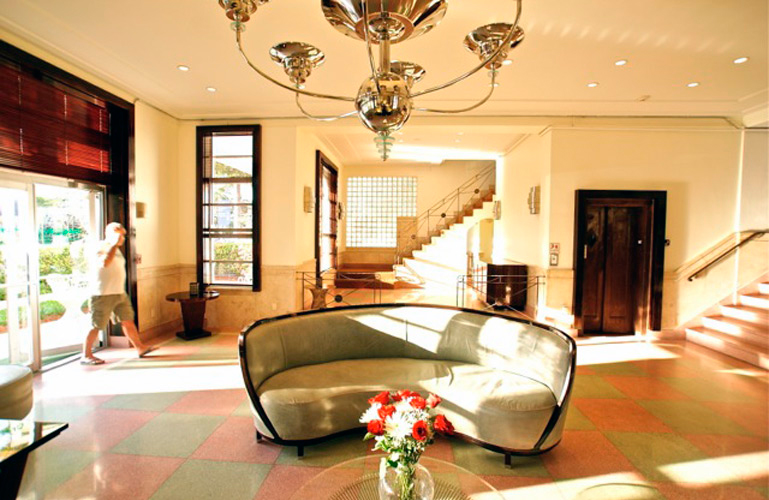 Amenities: This hotel’s amenities include a beautiful lobby, completely renovated in its original Art Deco style; a beautiful internal courtyard and an interesting collection of books for guests.